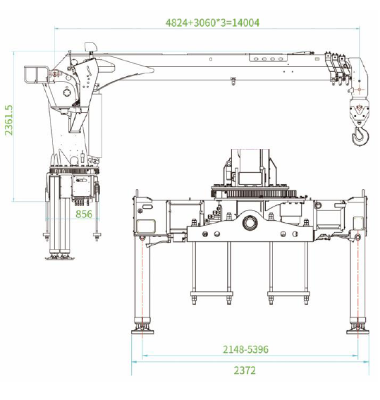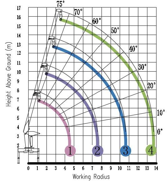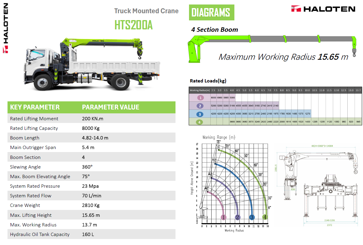Rated Lifting Moment 200 KN.m Rated Lifting Capacity 8 T Boom Length 4.82-14.0 m Main Outrigger Span 5.396 m Boom Section 4 Slewing Angle 360° Max. Boom Elevating Angle 75° System Rated Pressure 23 Mpa System Rated Flow 70 L/min Crane Weight 2810 Kg Max.Lifting Height 15.65 m Max. Working Radius 13.7 m Hydraulic Oil Tank Capacity 160 L LIFTING CHART