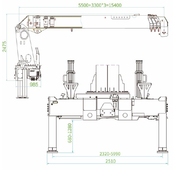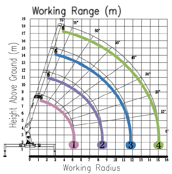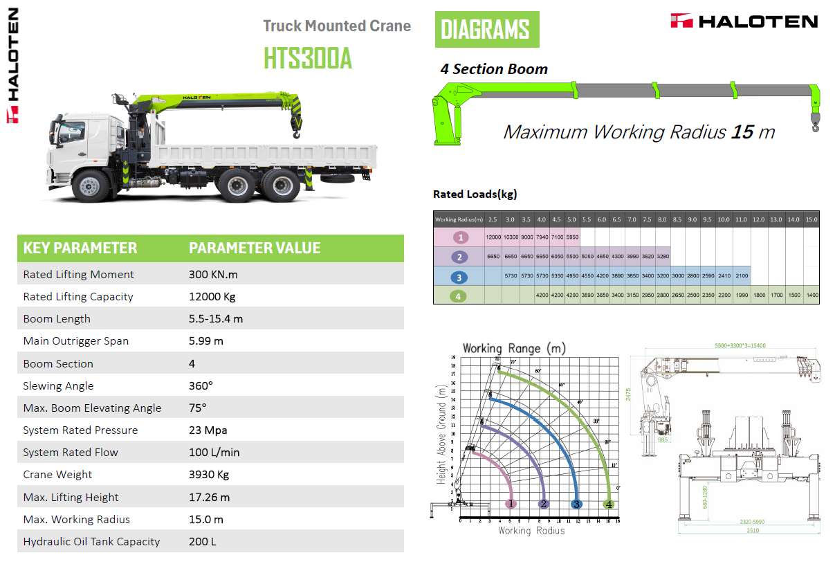 Rated Lifting Moment 300 KN.m Rated Lifting Capacity 12 T Boom Length 5.5-15.4 m Main Outrigger Span 5.99 m Boom Section 4 Slewing Angle 360° Max. Boom Elevating Angle 75° System Rated Pressure 23 Mpa System Rated Flow 100 L/min Crane Weight 3930 Kg Max.Lifting Height 17.26 m Max. Working Radius 15.0 m Hydraulic Oil Tank Capacity 200 L LIFTING CHART