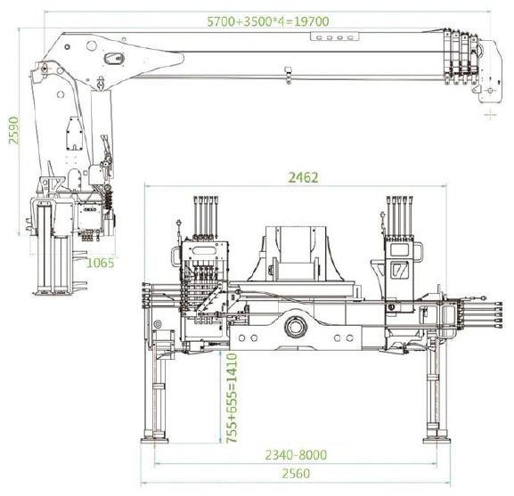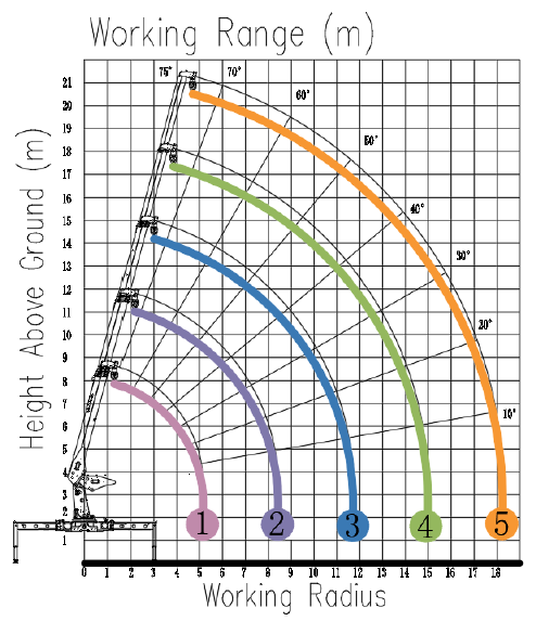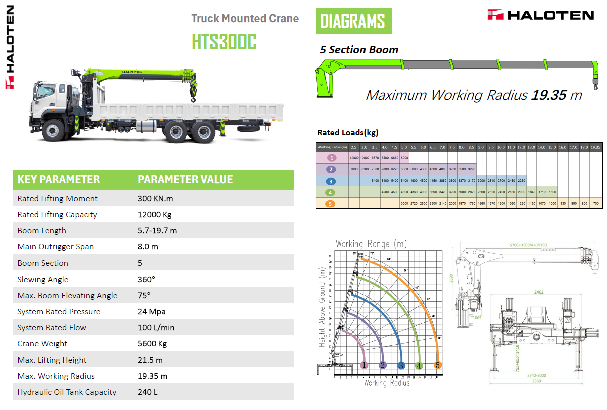 Rated Lifting Moment 300 KN.m Rated Lifting Capacity 12 T Boom Length 5.7-19.7 m Main Outrigger Span 8.0 m Boom Section 5 Slewing Angle 360° Max. Boom Elevating Angle 75° System Rated Pressure 24 Mpa System Rated Flow 100 L/min Crane Weight 5600 Kg Max.Lifting Height 21.5 m Max. Working Radius 19.35 m Hydraulic Oil Tank Capacity 240 L LIFTING CHART