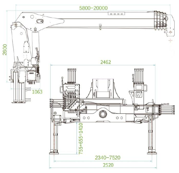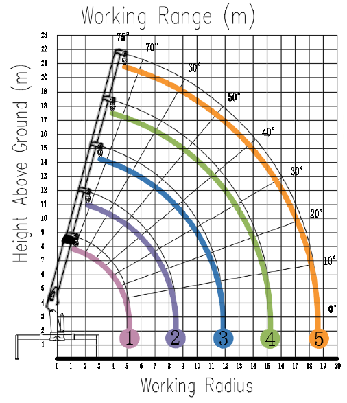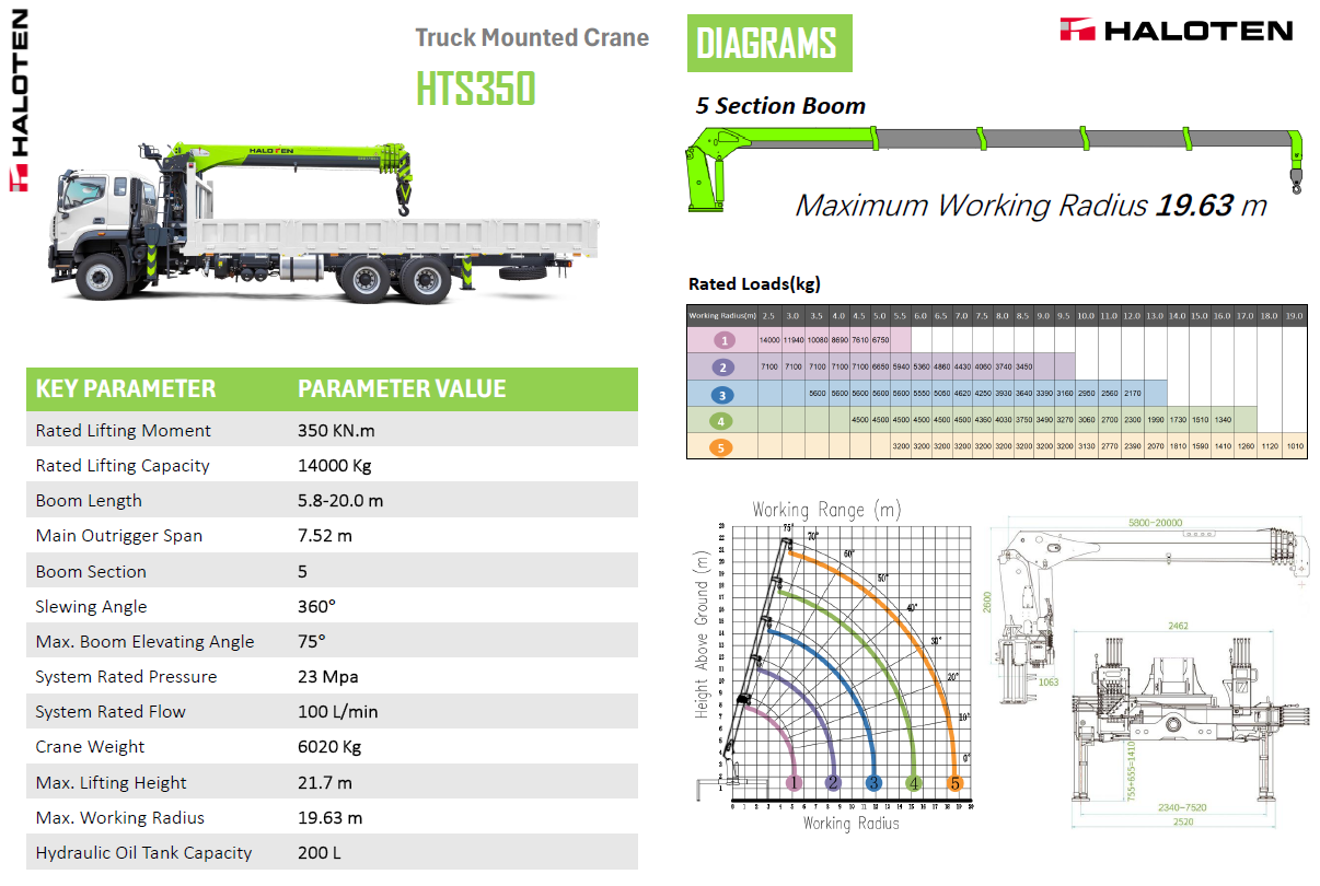 Rated Lifting Moment 350 KN.m Rated Lifting Capacity 14 T Boom Length 5.8-20.0 m Main Outrigger Span 7.52 m Boom Section 5 Slewing Angle 360° Max. Boom Elevating Angle 75° System Rated Pressure 23 Mpa System Rated Flow 100 L/min Crane Weight 6020 Kg Max.Lifting Height 21.7 m Max. Working Radius 19.63 m Hydraulic Oil Tank Capacity 200 L LIFTING CHART